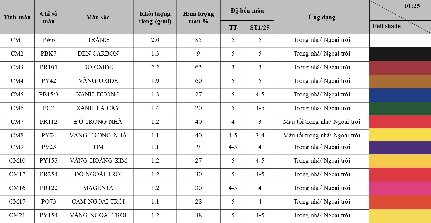 - Tinh màu CM được điều chế bằng chất làm ướt và phân tán không ion hoặc anion, tinh màu luôn có trạng thái đồng nhất, tính lưu động tốt, phương thức rót theo thể tích hoặc theo trọng lượng.